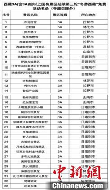 此次“冬游西藏”對(duì)外免費(fèi)游覽景區(qū)共33家,均為西藏國(guó)有3A(含3A)級(jí)以上景區(qū)。其中5A級(jí)景區(qū)2家,4A級(jí)景區(qū)10家。(景區(qū)名錄見(jiàn)下圖)