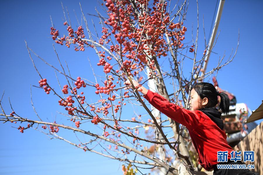 一名女孩在青海省海東市互助土族自治縣班彥新村中摘海棠果。新華社記者 戴天放 攝