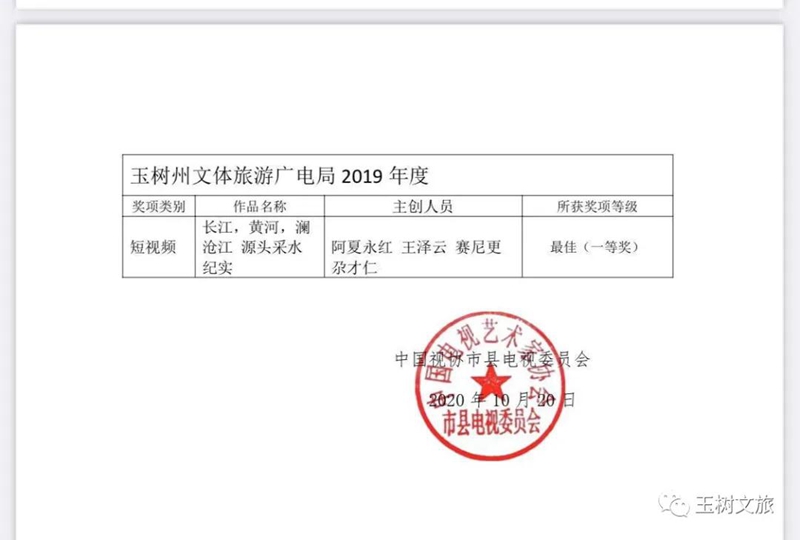 在當天舉行的第八屆全國市縣電視臺、融媒體中心推優(yōu)展播活動表彰晚會上,全國100多家市縣電視臺、融媒體中心的代表和來自全國各地的領導、嘉賓齊聚。活動現場頒發(fā)了最佳短視頻單位、最佳電視專題單位、最佳電視欄目單位、最佳綜藝晚會單位、媒體融合先導單位等獎項。玉樹藏族自治州文體旅游廣電局獲最佳短視頻單位,其2019年度短視頻作品《長江、黃河、瀾滄江源采水紀實宣傳片》獲得“最佳短視頻一等獎”榮譽。