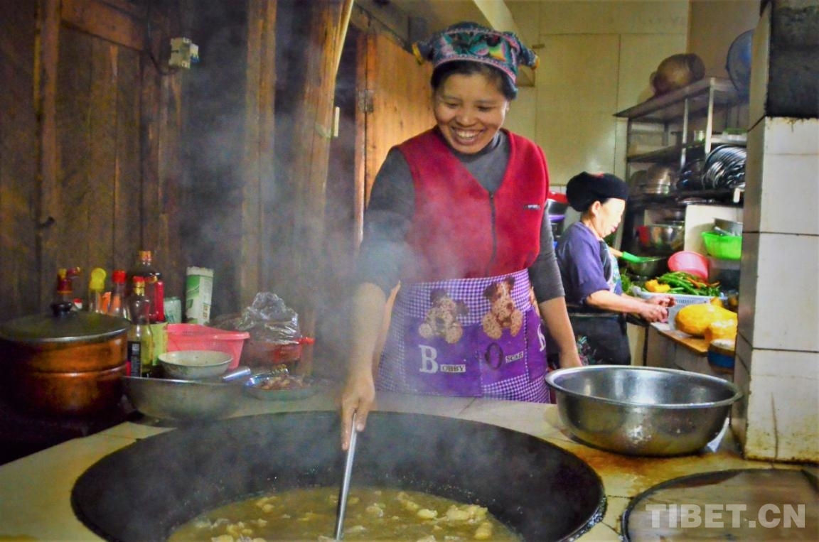 中國西藏網(wǎng)訊 上午十點多,差不多到了楊珍壽一天之中最忙碌的時候。她有條不紊地翻炒著大鐵鍋里的雞肉,母親在她身后切著菜,父親在劈著柴火。再過一個小時左右,自家的農(nóng)家樂就要開飯了。每到周末,更多游客會來到這里,忙碌翻倍,收入也會翻倍。