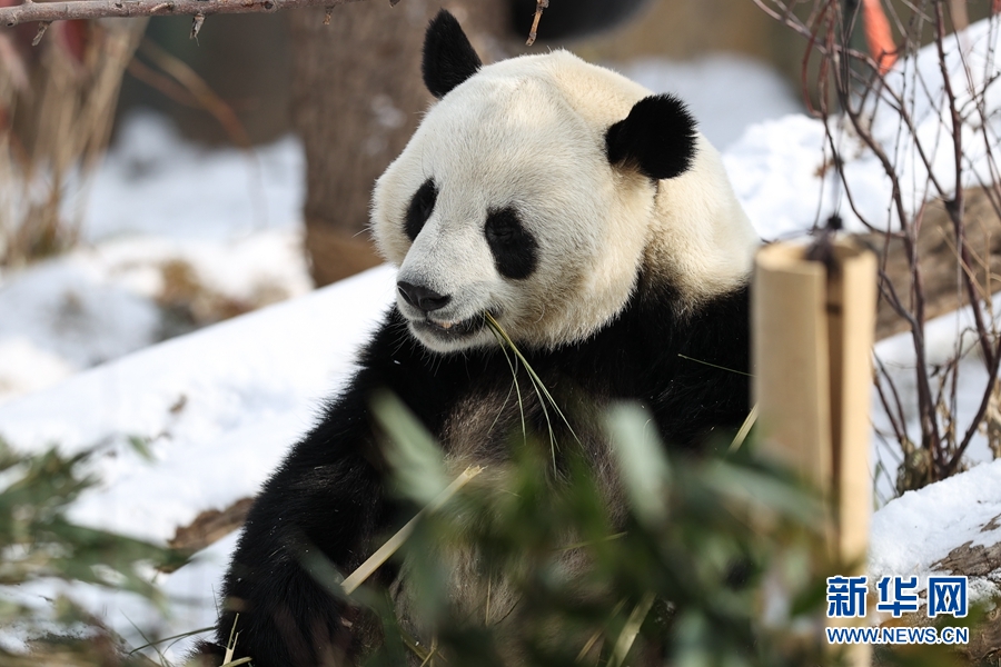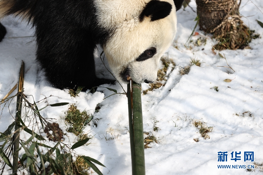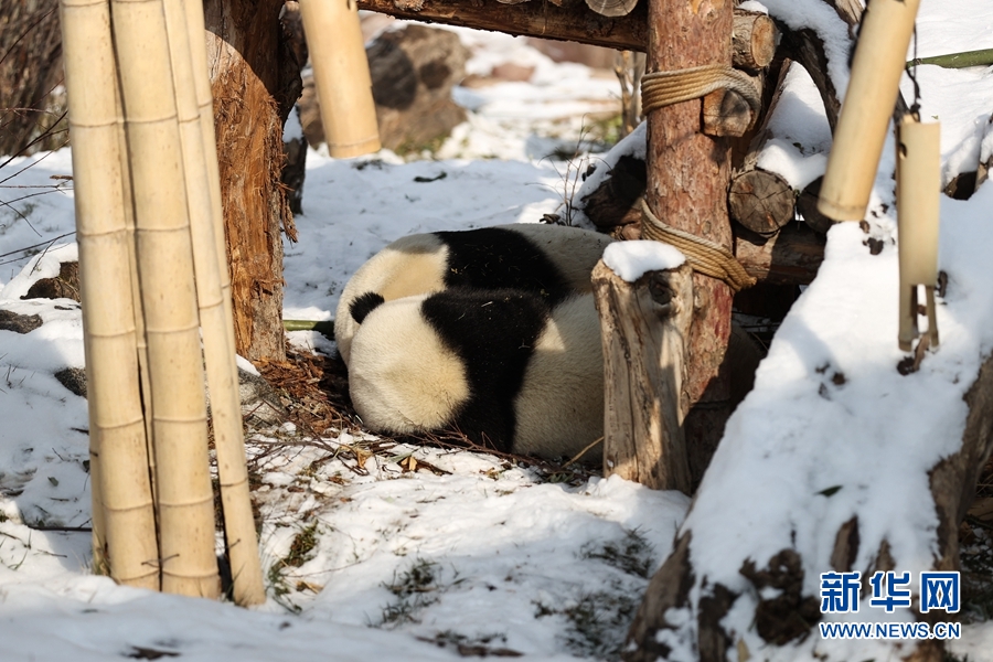 近日,受冷空氣影響,青海省西寧市迎來降雪。西寧熊貓館的四只大熊貓在雪天里享受著吃竹子、“打盹兒”的樂趣。
