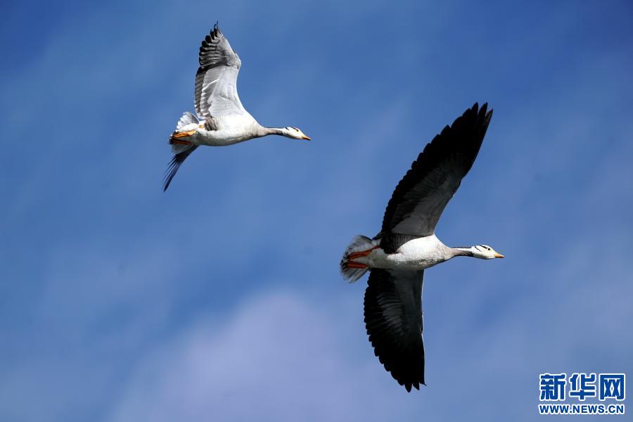 天光云影,百鳥翔集,一群赤麻鴨在都蘭湖國家濕地公園上空飛翔。(11月21日攝)新華網(wǎng) 潘彬彬攝