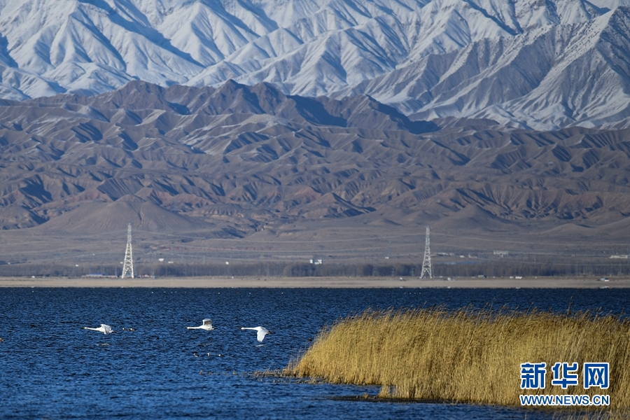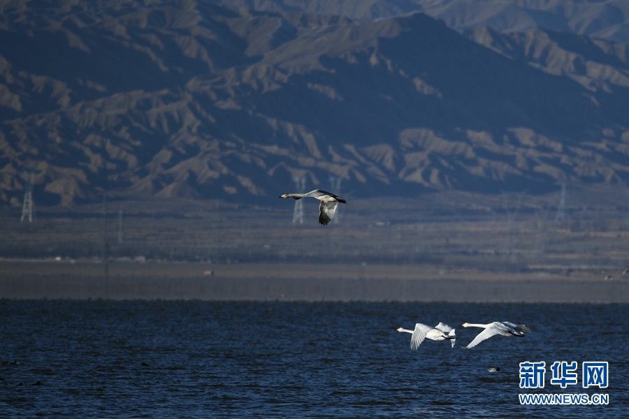 大天鵝、赤麻鴨在都蘭湖游弋。(11月21日攝)新華網(wǎng) 潘彬彬攝