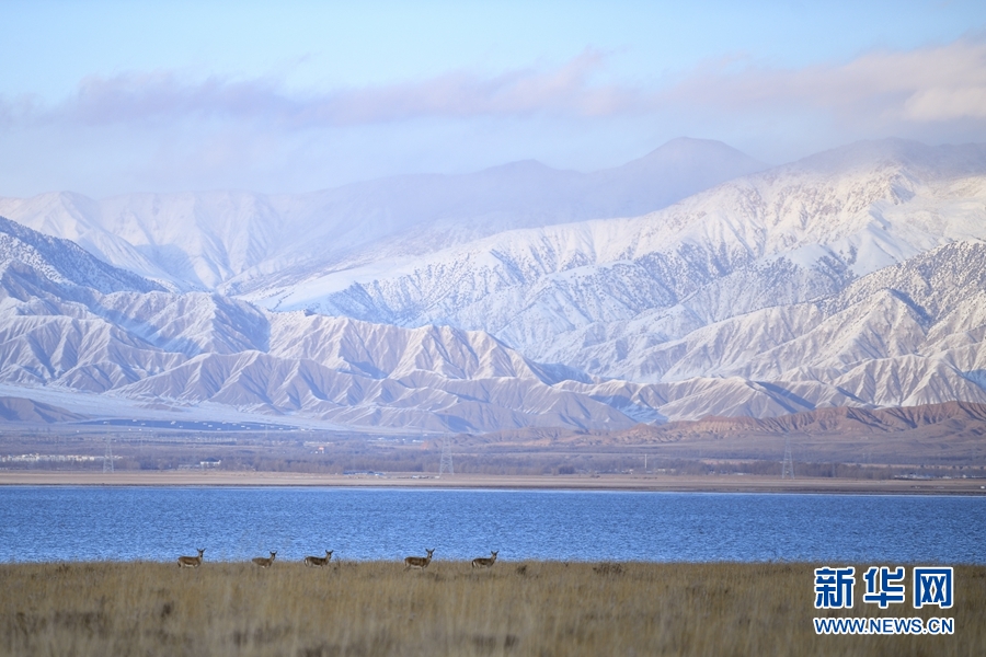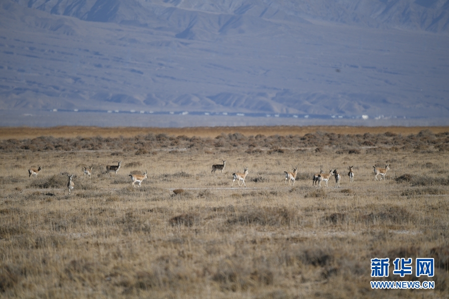 一群鵝喉羚在都蘭湖國家濕地公園內(nèi)活動。(11月21日攝)新華網(wǎng) 潘彬彬攝