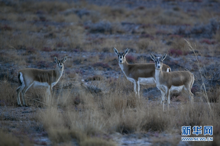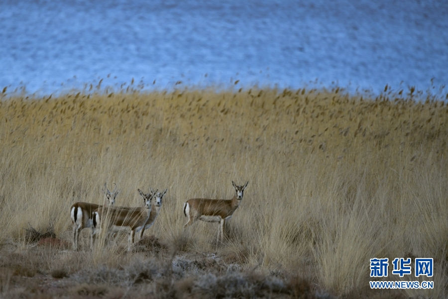 四只鵝喉羚在都蘭湖國家濕地公園內(nèi)活動。(11月21日攝)新華網(wǎng) 潘彬彬攝