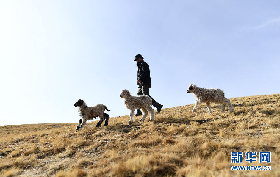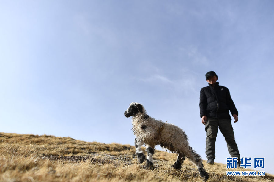 在青海省剛察縣泉吉鄉(xiāng)寧夏村,彭毛太和剛出生不久的小羊羔在一起(11月20日攝)。 新華社記者 張宏祥 攝
