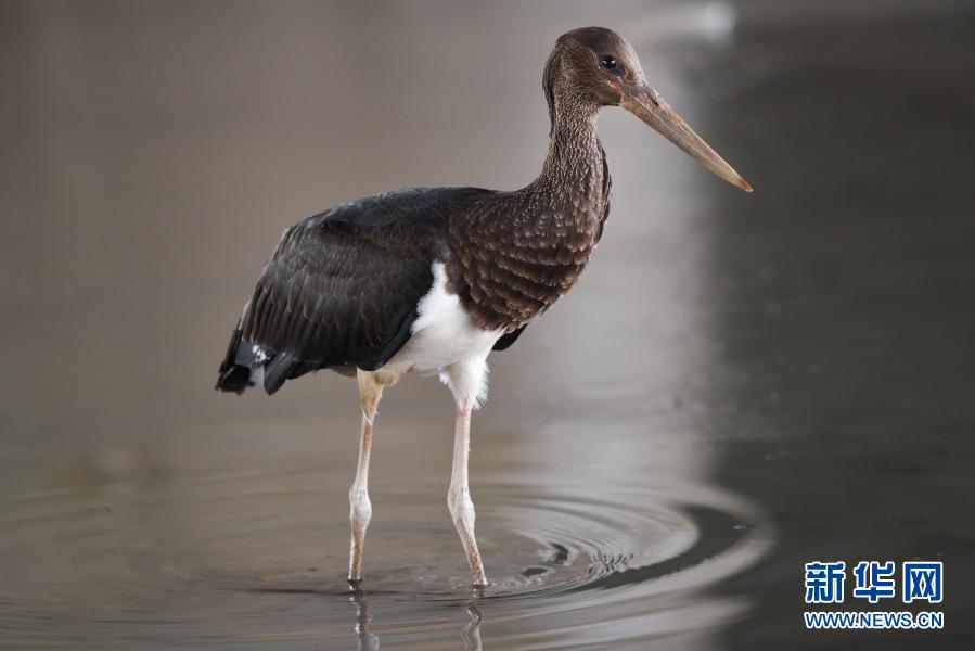 12月6日,一只黑鸛在西寧市北川河濕地公園內(nèi)嬉戲。新華社記者 吳剛 攝