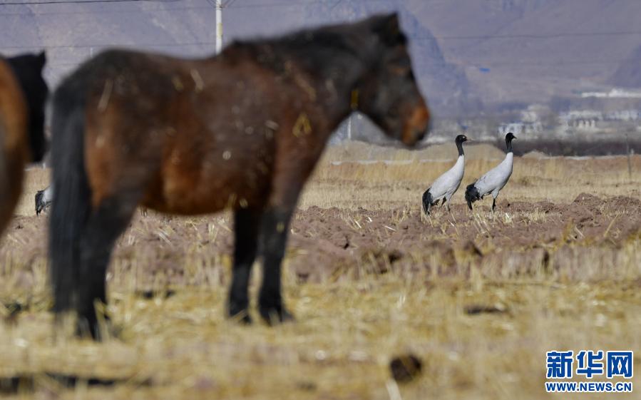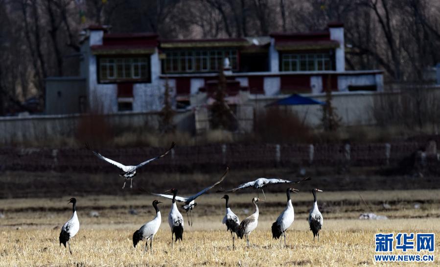 這是12月12日在林周縣黑頸鶴自然保護(hù)區(qū)卡孜鄉(xiāng)拍攝的黑頸鶴。新華社記者 黃豁 攝