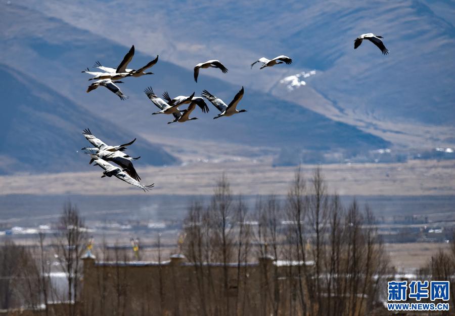 黑頸鶴在林周縣黑頸鶴自然保護(hù)區(qū)上空飛翔(12月12日攝)。新華社記者 黃豁 攝