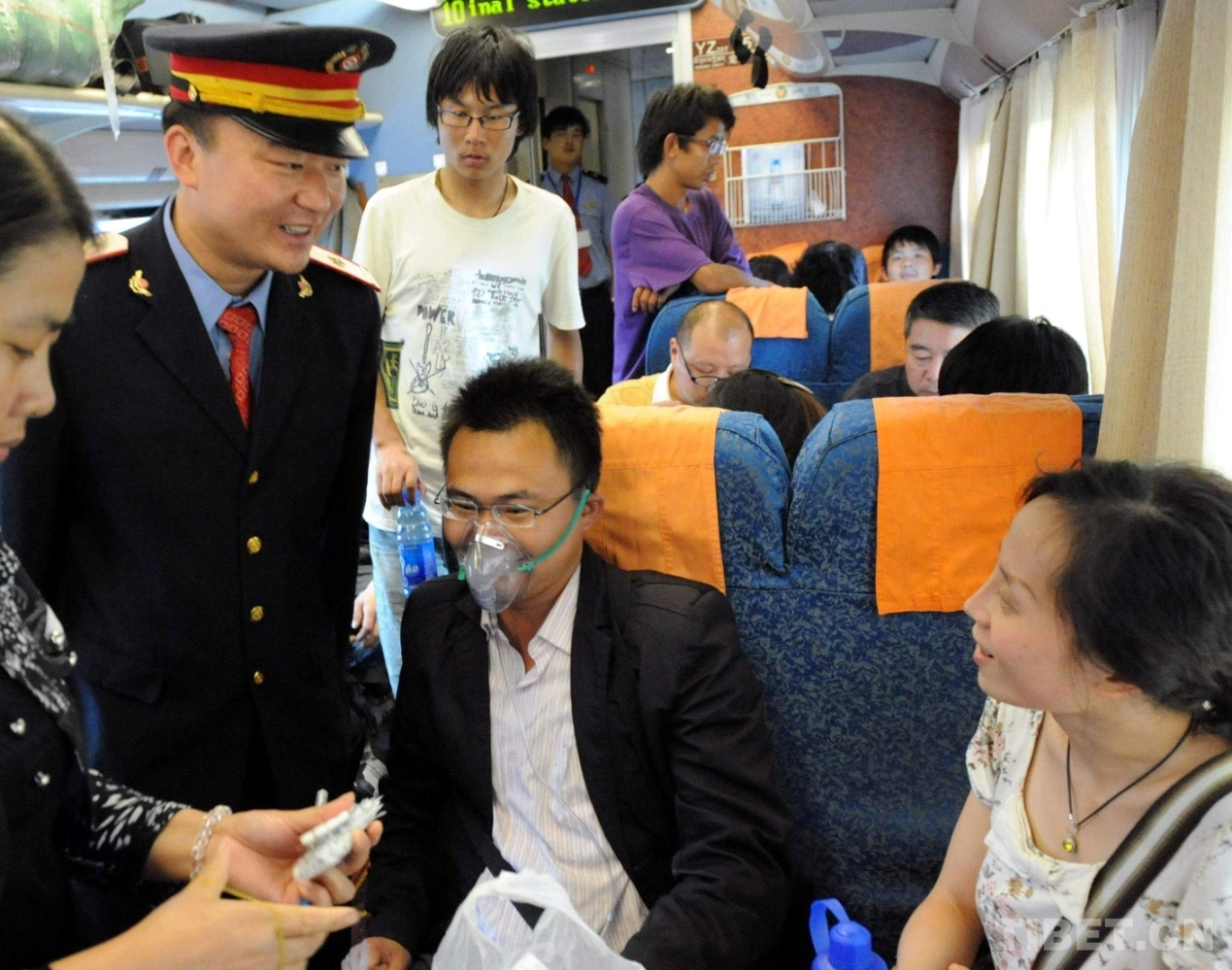 這是夫妻同在京藏列車(chē)上工作、被人們親切稱(chēng)為“高飛的比翼鳥(niǎo)”的京藏車(chē)隊(duì)十一組列車(chē)長(zhǎng)王寶山為身體不適的旅客送上氧氣面罩(唐召明2010年8月22日攝)