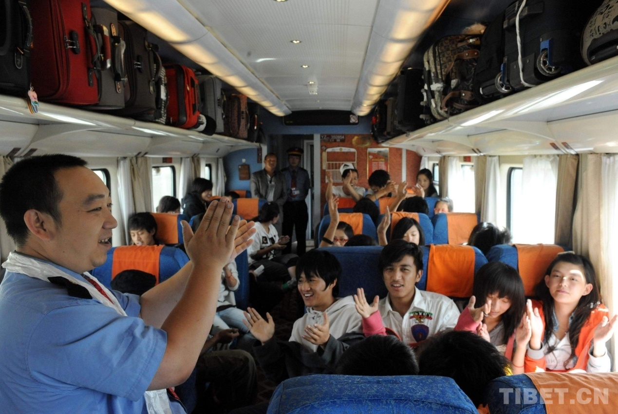 這是被稱(chēng)為“快樂(lè)大叔”的共產(chǎn)黨員、硬座車(chē)廂乘務(wù)員鄭志剛在北京開(kāi)往拉薩的京藏列車(chē)上,與藏族學(xué)生一起歡歌(唐召明2010年7月4日攝)