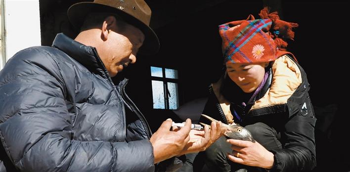 “你看,這只黑頸鶴是十幾天前我從田間救回來的,當(dāng)時它的翅膀和右腿都受了傷,奄奄一息,我還擔(dān)心救不活它。我把消炎藥放入酥油中攪拌制成膏藥,涂抹在它的傷口上,并給它喂了口服消炎藥,白天就把它放到院子里,讓它鍛煉受傷的腿腳。通過細(xì)心照料它恢復(fù)得很好,等它痊愈了,我就把它放歸大自然?!?9歲的巡護(hù)員多布杰高興地說。