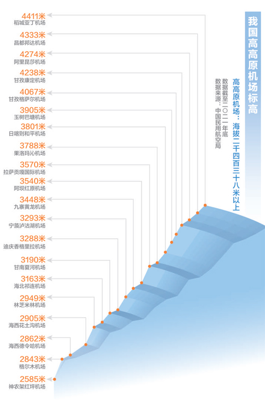 機(jī)場標(biāo)高在1524米至2438米的機(jī)場稱為“高原機(jī)場”。而“高高原機(jī)場”,指海拔高度2438米以上的機(jī)場,所在地區(qū)地形復(fù)雜、氣候惡劣、空氣稀薄,對機(jī)場建設(shè)、航空器運(yùn)維和人員素質(zhì)都提出了更高要求。截至2021年底,我國共有已投運(yùn)高高原機(jī)場20個(gè),其中稻城亞丁機(jī)場海拔4411米,為世界海拔最高的機(jī)場。高高原機(jī)場不僅為當(dāng)?shù)貛ト藲?,推?dòng)經(jīng)濟(jì)社會(huì)發(fā)展,還顯著改善中西部地區(qū)交通條件,為建設(shè)交通強(qiáng)國發(fā)揮重要作用。