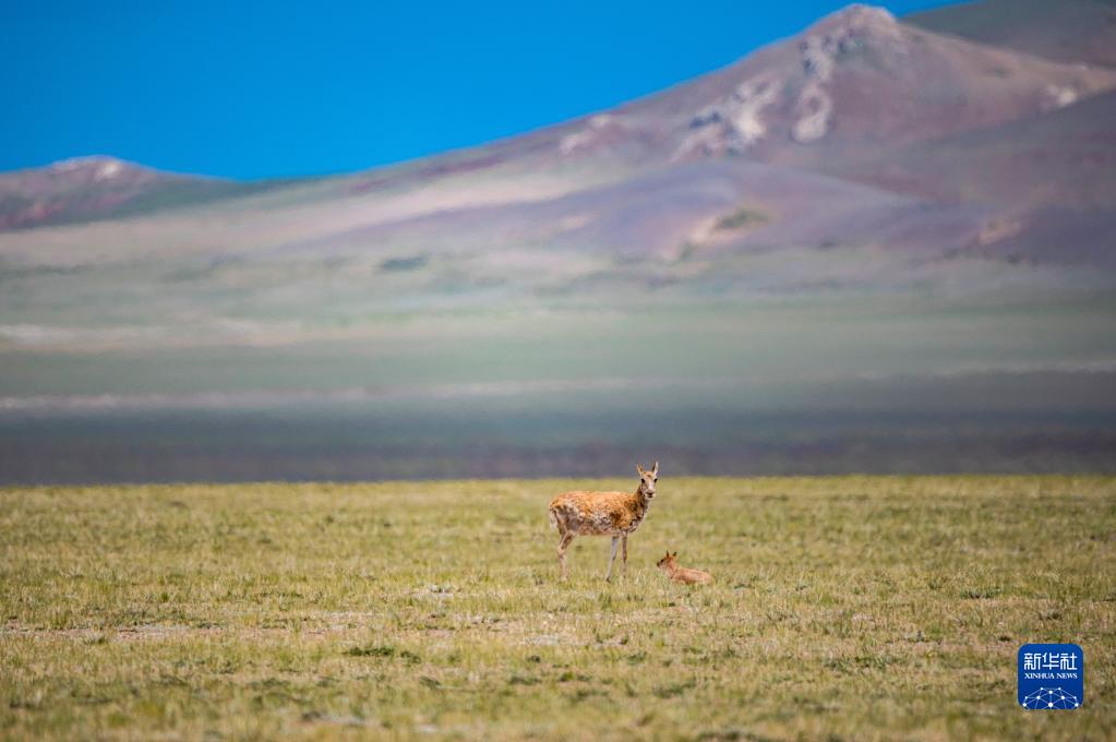在羌塘國(guó)家級(jí)自然保護(hù)區(qū),一只母藏羚羊在看護(hù)其幼崽(7月11日攝)。新華社記者 周荻瀟 攝