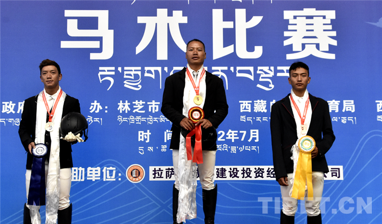 圖為7月17日競技馬術項目場地障礙個人賽頒獎現(xiàn)場(中間為冠軍選手日喀則市代表團巴迪,左邊為亞軍選手山南市代表團選手諾桑,右邊為季軍選手林芝市代表團單增洛追) 攝影:德吉卓嘎