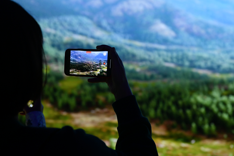 參觀者在祁連山國(guó)家公園青海片區(qū)展陳中心內(nèi)的球幕影院拍攝。