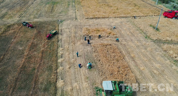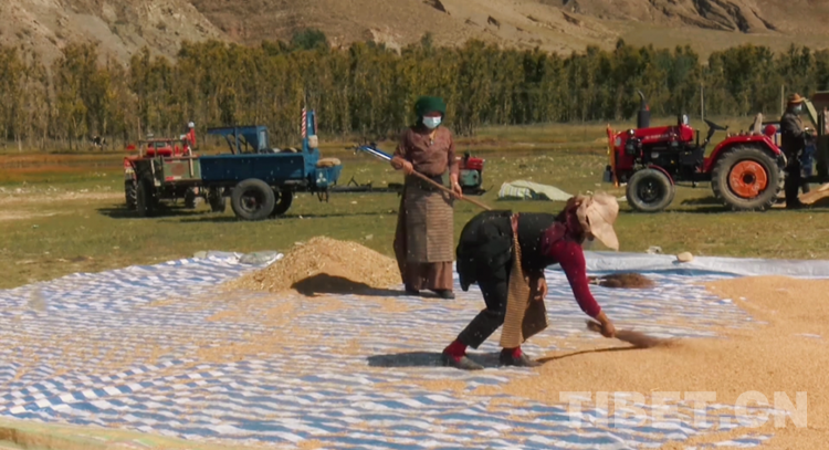 在達(dá)孜區(qū)雪鄉(xiāng)扎西崗村,隨著機(jī)器轟鳴,一顆顆金色飽滿的青稞粒構(gòu)成一扇彩虹門,有人在曬青稞、有人在裝袋、有人在搬運(yùn),一幅和諧的秋收圖展現(xiàn)在眼前。