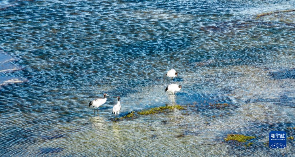 9月16日在多慶湖邊拍攝的黑頸鶴(無人機照片)。新華社記者 晉美多吉 攝
