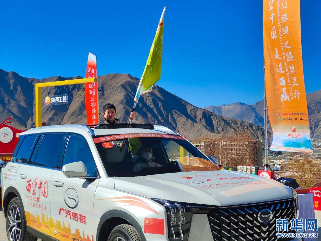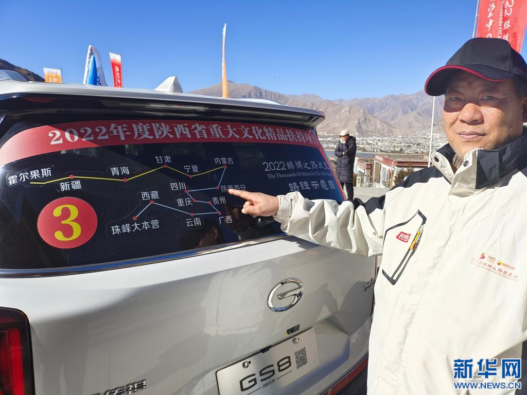 在拉薩市文成公主實(shí)景劇場前的廣場上,一列車隊(duì)緩緩駛過。有人從天窗探出身子揮舞著旗幟,旗上寫著:“2022絲綢之路萬里行,西望中國”。