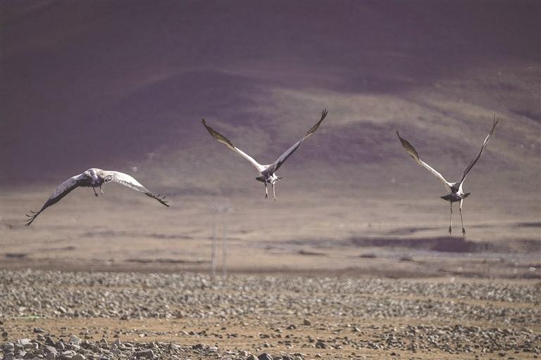 在西藏,黑頸鶴從越冬地到繁殖地有兩條線路:一條是拉薩到色林措,另一條則是從日喀則到色林措。整體來說,是從雅魯藏布江中游河谷黑頸鶴國家級自然保護區(qū)飛往色林措黑頸鶴保護區(qū),兩個保護區(qū)之間有一條固定的黑頸鶴遷徙路線,每年黑頸鶴會在3月中旬從越冬地雅江中游河谷及其支流拉薩河、年楚河流域的“一江兩河”地區(qū),飛去羌塘北部草原繁育后代;又會于11月中旬從繁殖地那曲的班戈縣、申扎縣、嘉黎縣,阿里的日土縣、普蘭縣,日喀則的昂仁縣,拉薩的當雄縣返回到越冬地。對于雅江中游河谷來說,它是冬候鳥;對于羌塘北部草原來說,它是夏候鳥。