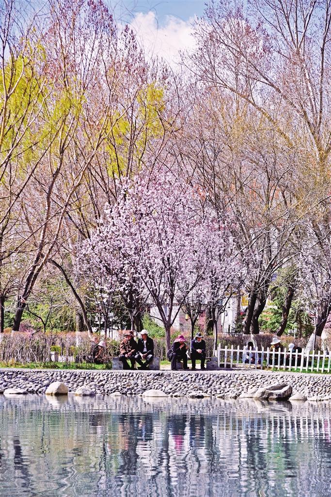 那么,去哪里查收這份“春日限定大禮包”呢?最近幾天,記者的朋友圈都被帕崩崗的美景霸屏了,一波又一波的朋友到這里打卡。除了去帕崩崗賞桃花,更不容錯過的一定是拉薩大街小巷以及公園中驚鴻一瞥的美景。宗角祿康公園植被繁茂、古樹較多,一到春季,玫粉色的榆葉梅綻放枝頭,層層花瓣在陽光的照耀下嬌俏動人,一樹粉色花朵倒映在幽綠的湖水中,盡顯詩意。此外,緊鄰羅布林卡的羅堆東路也有意想不到的美景,每到這個季節(jié),紅葉李便會沿路盛開,淡粉色的花瓣搭配深紅色的花蕊,甚是好看。金珠西路沿途的景色也令人耳目一新,淡粉色的花朵肆意綻放,等紅燈時的心情因這些花朵變得不再焦灼。