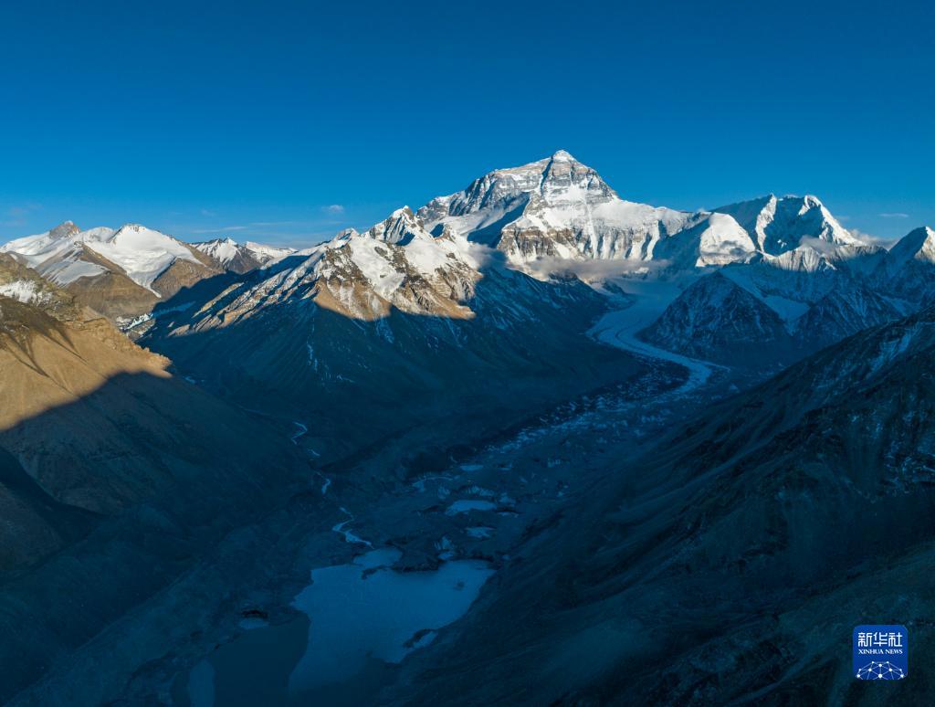 這是日落時(shí)分的珠峰和絨布冰川(5月16日攝,無(wú)人機(jī)照片)。新華社記者 晉美多吉 攝