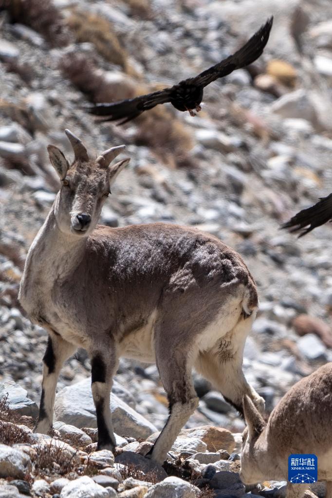 這是在珠峰國家級自然保護(hù)區(qū)內(nèi)拍攝的巖羊和黃嘴山鴉(5月13日攝)。新華社發(fā)(旦增努布 攝)