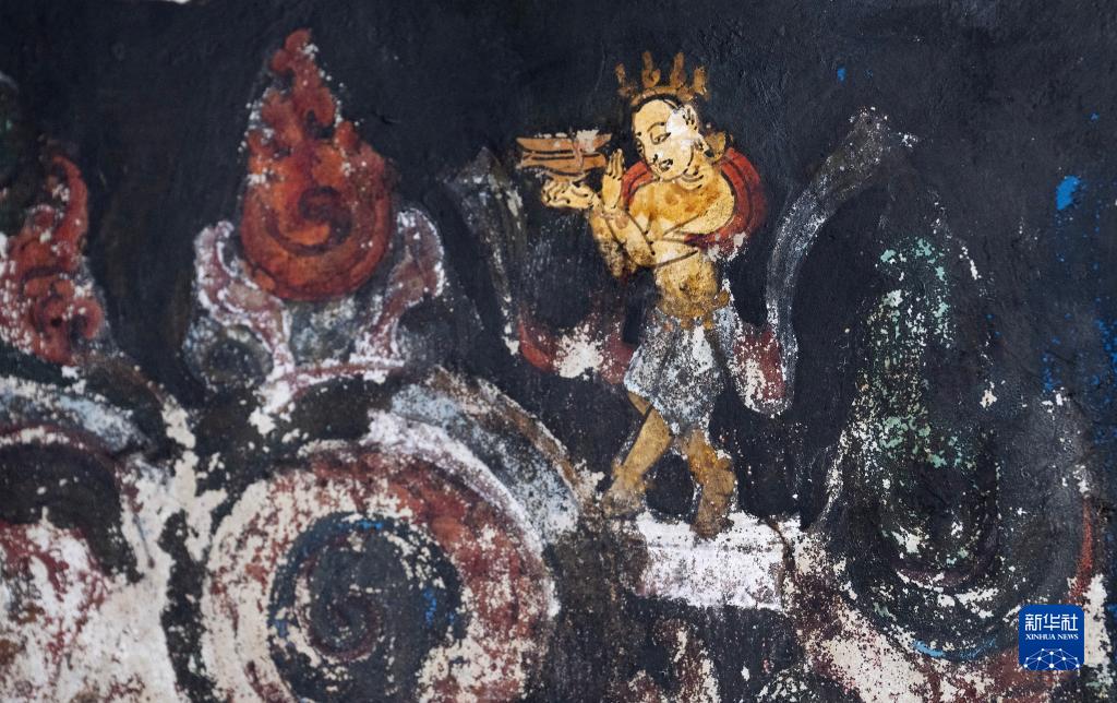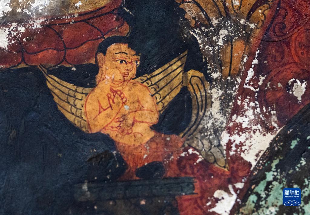 這是5月26日拍攝的皮央石窟壁畫中的長翅膀的人物造型。新華社記者 費(fèi)茂華 攝