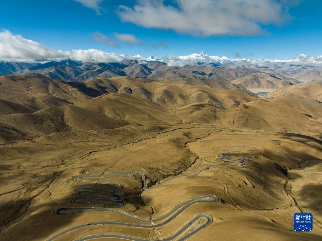 這是在海拔6000米左右高空拍攝的通往珠峰的公路(5月26日攝,無人機(jī)照片)。新華社發(fā)(旦增努布 攝)