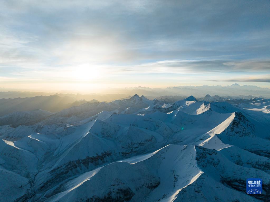 這是在海拔8000米左右高空拍攝的珠穆朗瑪峰和喜馬拉雅山脈群山(5月23日攝,無人機(jī)照片)。新華社記者 洛卓嘉措 攝