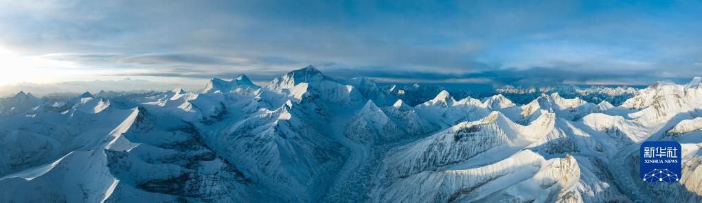 這是喜馬拉雅山脈五座海拔8000米以上的高峰。從左到右依次為:馬卡魯峰、洛子峰、珠穆朗瑪峰、卓奧友峰、希夏邦馬峰(5月26日攝,拼接照片)。新華社記者 孫非 攝