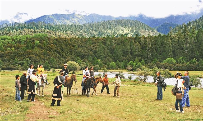 游客在魯朗景區(qū)騎馬游玩。
