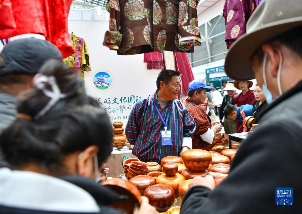 展會上的不丹商人向顧客銷售不丹服裝和木碗(6月18日攝)。新華社記者 晉美多吉 攝