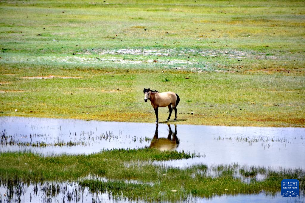 班公湖畔的駿馬(7月28日攝)。新華社記者 劉文博 攝