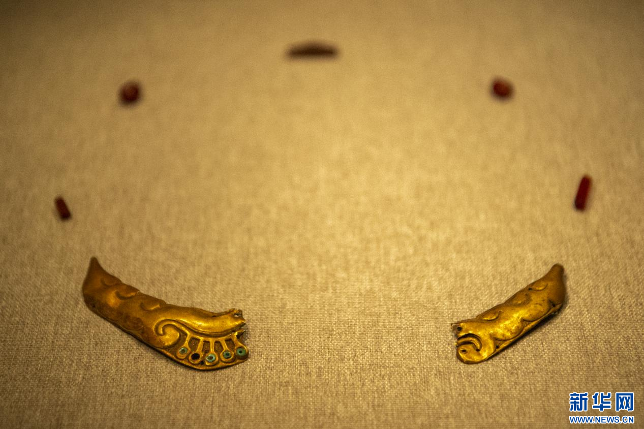 西藏阿里博物館展品,從曲踏墓葬出土的“金掛飾”(8月23日攝)。新華網(wǎng) 旦增努布 攝