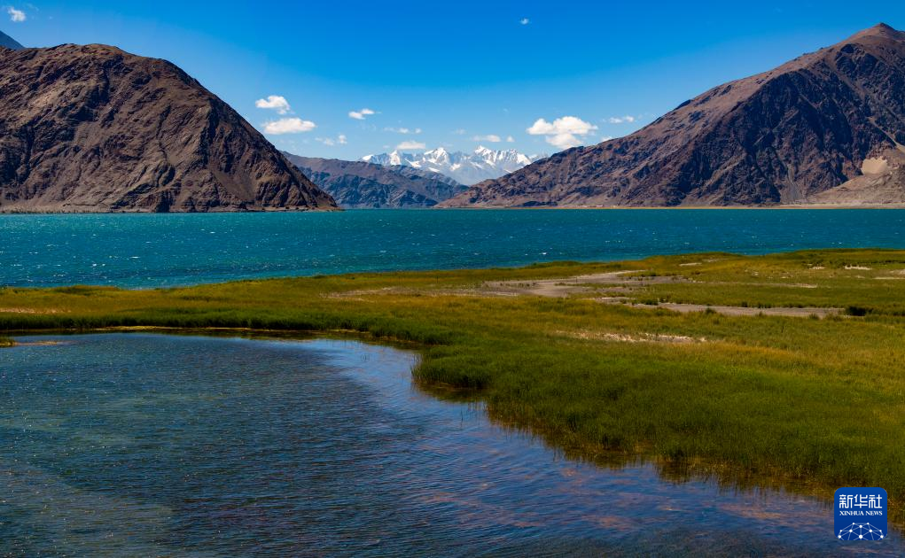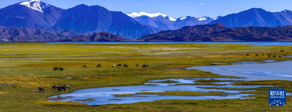 鳥瞰班公湖畔的濕地(無人機照片,9月21日攝)。新華社記者 姜帆 攝