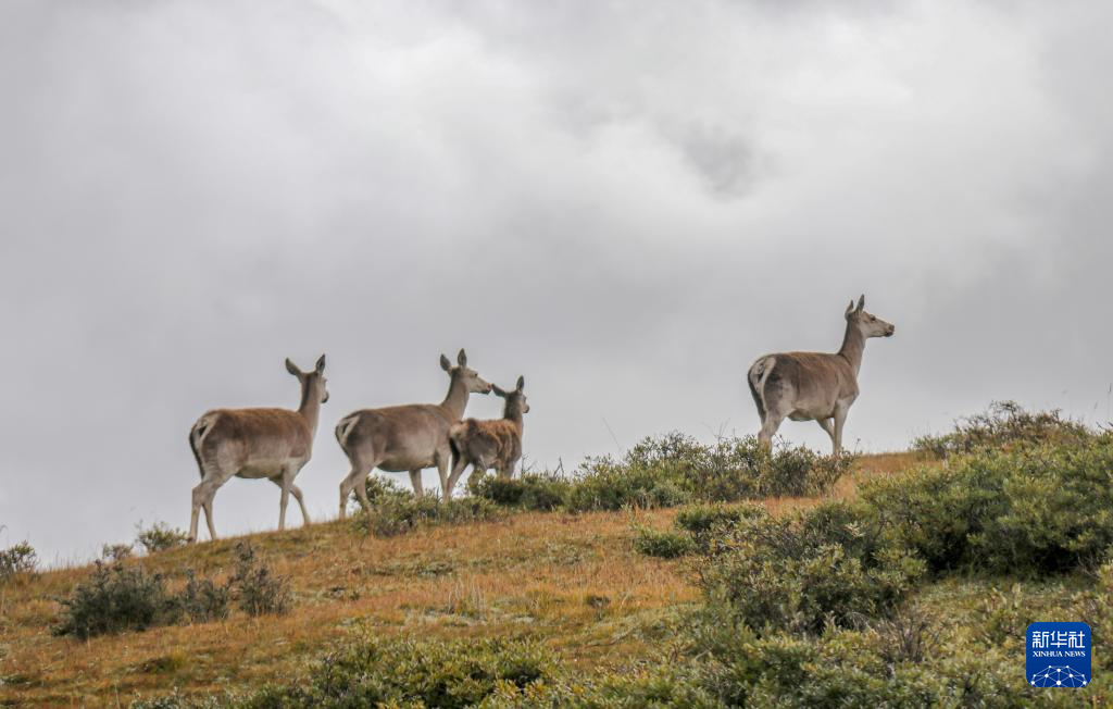9月24日,幾只西藏馬鹿出現(xiàn)在位于西藏自治區(qū)山南市桑日縣的貢德林草原上。新華社記者 邵澤東 攝