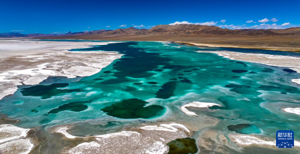 這是位于革吉縣鹽湖鄉(xiāng)的魯瑪仁布錯(cuò),湖畔白色地表為天然鹽礦(無人機(jī)照片,9月24日攝)。新華社記者 姜帆 攝