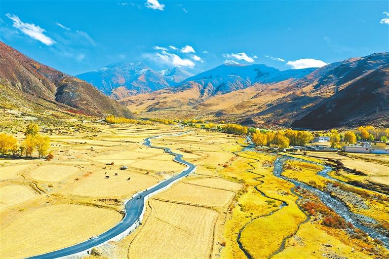 不僅如此,不管是往北通向唐嘎鄉(xiāng)的路,還是往南通向章多鄉(xiāng)的路,或是通往各個(gè)村莊的路,都在爭先恐后地訴說著金秋的美麗。道路兩旁聳立著金黃色的楊樹,陽光透過樹葉,散落在道路上,一種靜謐而淡然的美,劃過車窗。