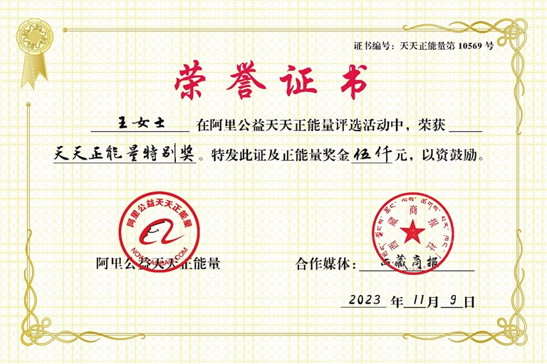 阿里公益天天正能量聯(lián)合西藏商報(bào),為王女士頒發(fā)5000元天天正能量特別獎(jiǎng)。感謝她的善舉,讓快要消失的“捎”字重現(xiàn)。這世間,唯有愛與信任不可辜負(fù)。