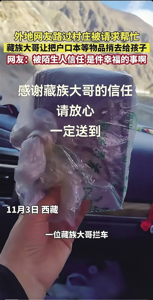 11月3日,王女士和先生進(jìn)藏自駕游,途經(jīng)昌都市洛隆縣境內(nèi)一處村莊時(shí),被一位藏族大哥攔下車輛。大哥邊說藏語、邊比劃著請(qǐng)王女士幫忙把戶口本帶到昌都市?!拔覀兟牪欢刈宕蟾缭谡f什么,他就直接把戶口本塞給我了,最后說了一句謝謝,瀟灑離去。當(dāng)時(shí),我和老公很驚訝,沒想到他這么相信我們?!?/p>
