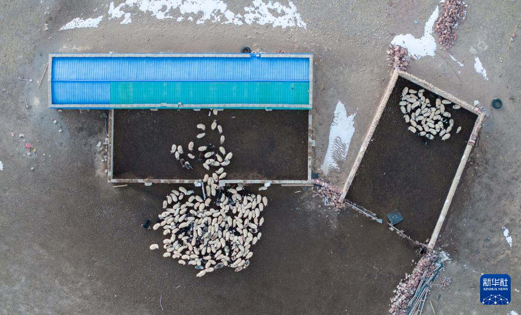 太陽落山,丹增家的羊回到棚圈。其中左側(cè)藍(lán)頂?shù)氖侨ツ晷律w的封閉式棚圈,右側(cè)是傳統(tǒng)的敞開式羊圈(無人機照片,12月18日攝)。新華社記者 姜帆 攝