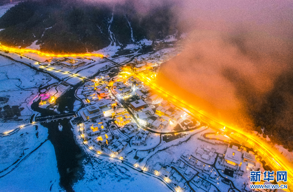 圖為1月3日夜幕初始的魯朗國際旅游小鎮(zhèn)(無人機(jī)照片)。新華網(wǎng)發(fā) 姚力 攝