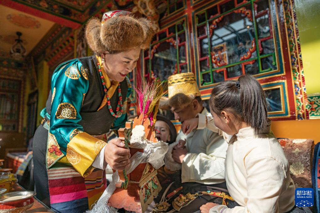 1月12日,巴桑普尺的女兒次仁普尺(左一)為家人獻(xiàn)上寓意五谷豐登的“切瑪”。新華社發(fā)(丁增尼達(dá) 攝) ??