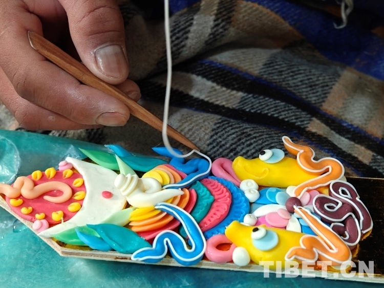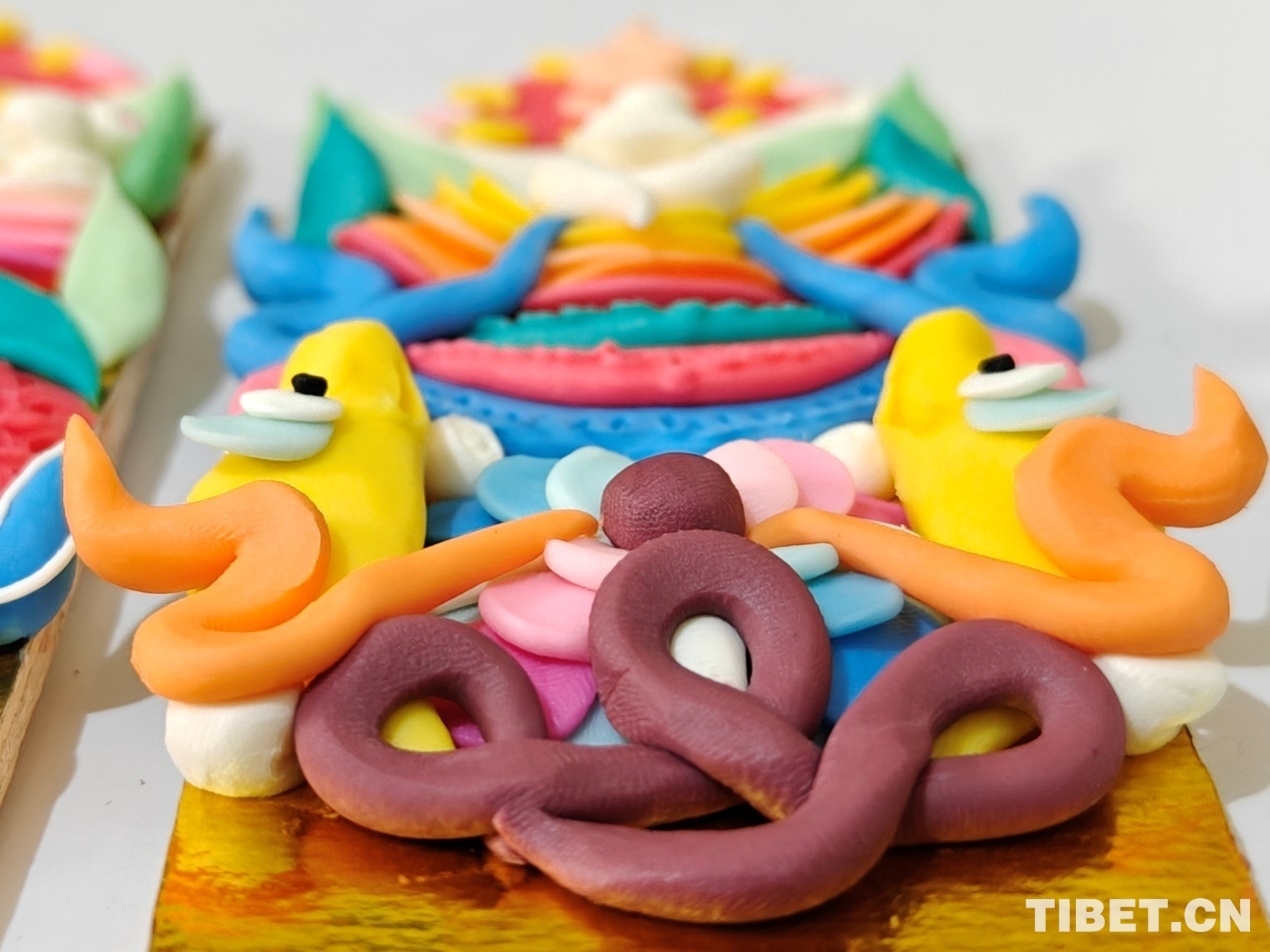 頓珠的二兒子丹增朗杰今年只有19歲,是一名高中生,但制作酥油花的手法已經(jīng)極為嫻熟。他盤(pán)腿而坐,面前擺放著調(diào)制好的各色酥油和一盆清水。只見(jiàn)他捏取一小塊酥油在冷水中浸泡一會(huì),然后熟練地用食指和拇指將酥油捏成不同形狀,粘貼于一塊盾形木板上,一對(duì)對(duì)色彩斑斕、寓意吉祥的酥油花作品便完成了。
