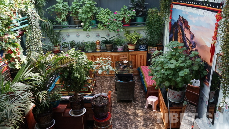 德瓊家庭旅館以女主人次仁德瓊的名字命名。工作人員告訴我們,這里是拉康鎮(zhèn)生意最好的旅館之一。旅館位于兩條主干道交接的拐角,地理位置好,招牌也立得醒目,每個(gè)進(jìn)入鎮(zhèn)子的人第一眼就能看到德瓊家庭旅館的招牌。但生意好絕不僅僅是因?yàn)榈乩砦恢脙?yōu)越。走進(jìn)這間旅館,如同進(jìn)入一間溫室花棚。在這里,花草植物是絕對的主角,各色草本、藤本、灌木植物高低錯(cuò)落,幾乎填滿了墻壁空間。蕭瑟的冬日里,粉的、白的、紅的花朵擠擠挨挨地開著,茉莉、山茶、三角梅...來自不同地域的花卉植物在這邊境小鎮(zhèn)的一隅競相綻放,天南海北在此握手言和。德瓊阿佳用她對生活的熱情將家庭旅館裝點(diǎn)得生機(jī)盎然,我想正是這份純真的熱愛才是德瓊家庭旅館生意火爆的關(guān)鍵所在。