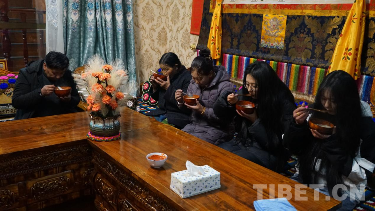 下午時(shí)分,“古突”夜的準(zhǔn)備就開始了,先是將羊肉放入鍋中燉煮,再是將白蘿卜切片備好,隨后與奶奶、兩個(gè)女兒及丈夫,一家人圍坐在溫暖的廚房說說笑笑地捏“古突”里的面疙瘩,做面疙瘩時(shí),要準(zhǔn)備一些稍大的特殊面疙瘩,分別包進(jìn)寫有石子、辣椒、羊毛、木炭等字樣的紙條,代表“心腸硬”“刀子嘴”“心腸軟”“黑心腸”等含義,待到吃“古突”環(huán)節(jié),來一場藏式風(fēng)格的“開盲盒”,據(jù)說每個(gè)人吃到的字樣能在某種程度上代表新一年的運(yùn)勢或性格。