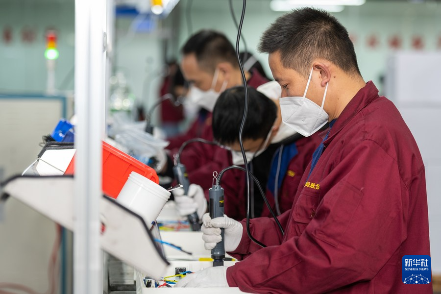 在拉薩市一家工廠內(nèi),工人在電器裝配生產(chǎn)線上作業(yè)(2022年11月28日攝)。新華社記者 周荻瀟 攝