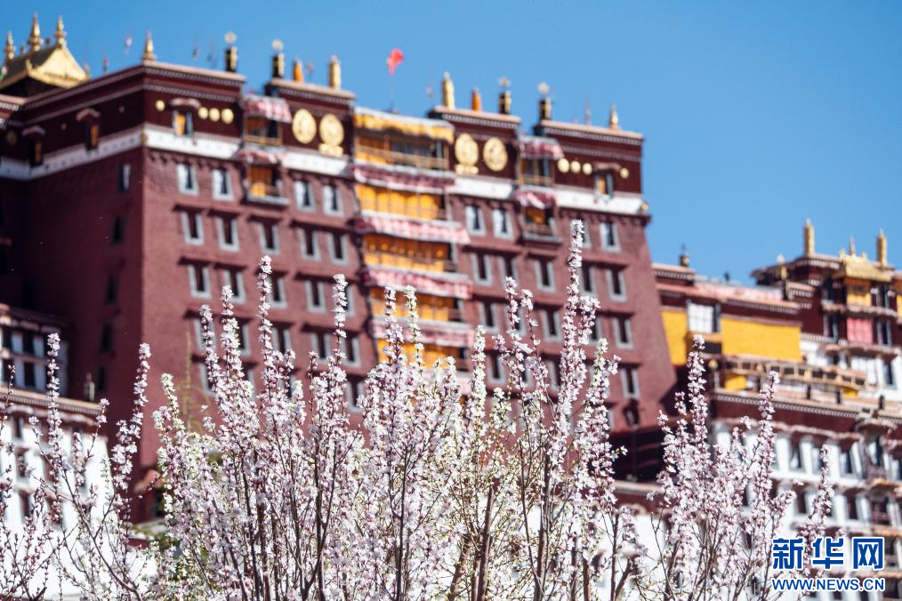 3月15日,杏花映襯下的布達(dá)拉宮。新華網(wǎng) 旦增努布 攝
