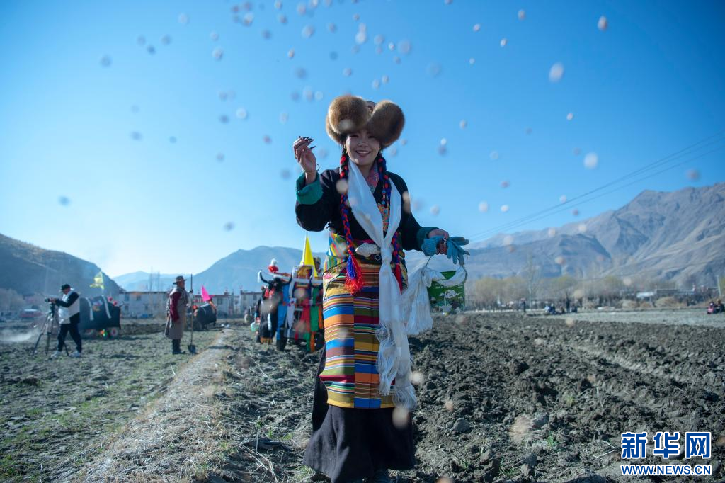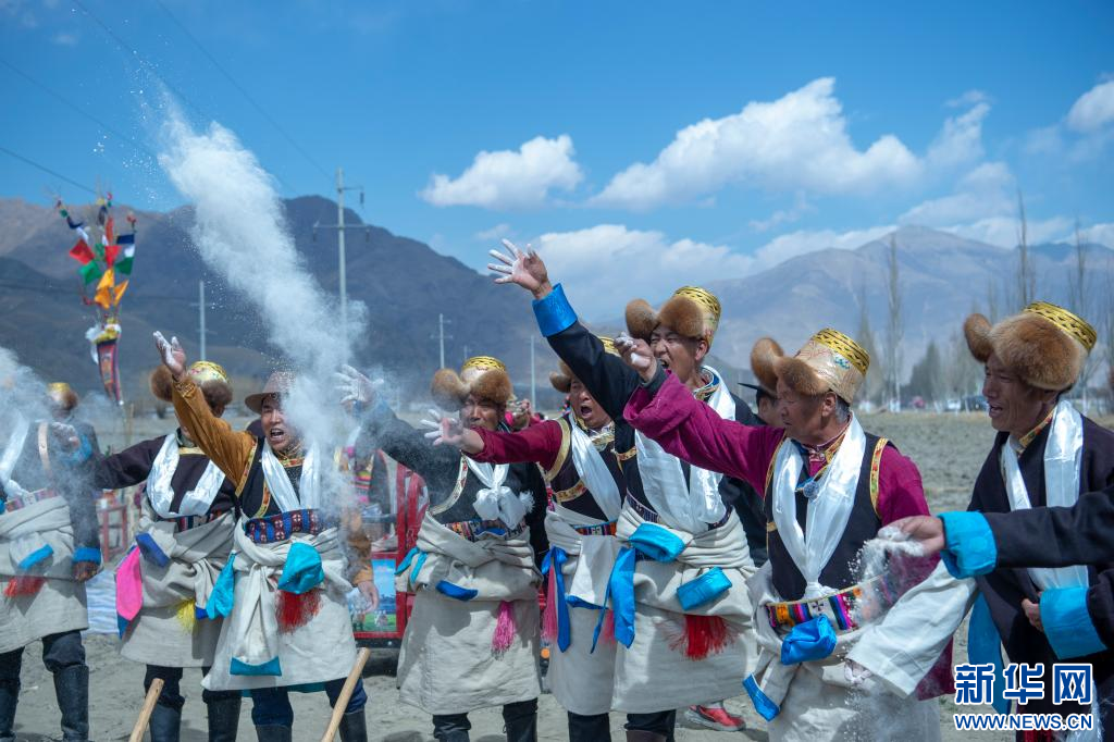 3月16日,克松社區(qū)居民在參加春耕儀式,播撒種子。新華網 旦增努布 攝 ??